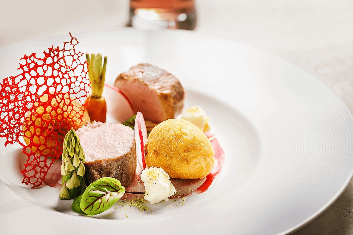 Wrap the cleaned and washed veal loin with the thyme in food foil and wrap. Place in a Sous Vide machine at 65°C for approx. 2,5 hours. Sear and season with salt and pepper before serving. Prepare the potato-potato croquettes using the evaporated dough. Melt the water with the butter and salt. Add the plain flour to the mixture, stirring constantly until the dough begins to peel away from the edges of the pot. At this point, add the eggs one at a time so that the mixture does not curdle and reaches a soft - lump-free consistency. To the prepared evaporated batter, add the grated sausage and the cooked mashed potatoes. Shape the cooled dough into balls, roll in breadcrumbs and fry. Blanch the cleaned and washed green asparagus with lemon, salt and sugar-flavoured water for about 1 minute. Place in a bowl of ice water and puree with the butter and salt.