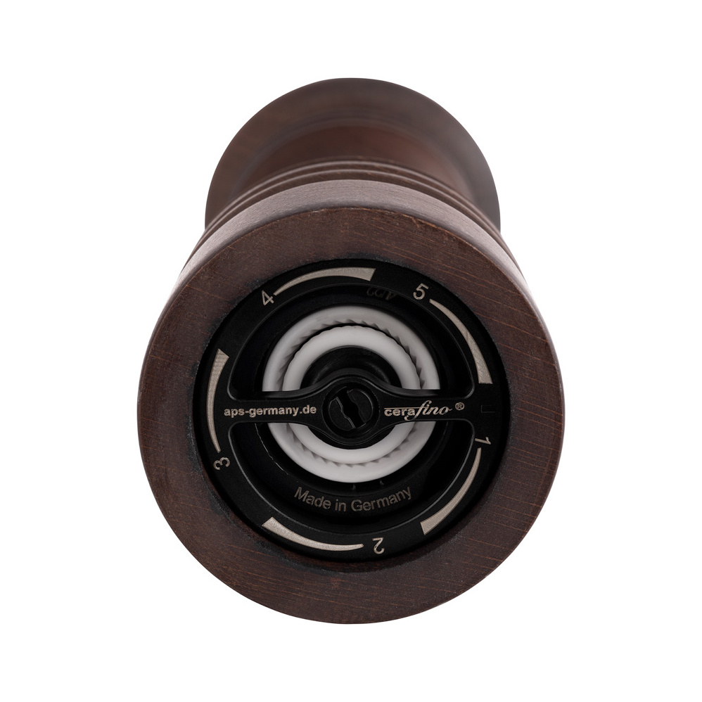 Mlynček na korenie s plynulou zmenou nastavenie hrúbky mletia. Keramický mlecí mechanizmus. Telo a hlava  mlynčeka z bukového dreva v tmavej úprave. Nepoužívajte umývačku riadu. Čistite len mäkkou vlhkou handričkou. Rozmery Ø6cm x 23cm (výška).