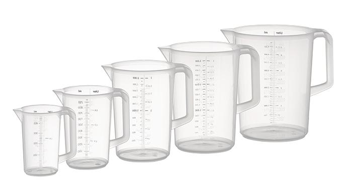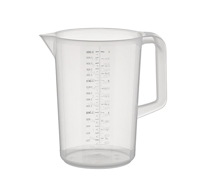 Transparent measuring cup made of polypropylene with closed handle. The measuring cup has a printed litre and ml scale. Dimensions Ø 17,0cm x 23,5cm (height). Volume 3,0L. Dishwasher safe. Stackable.