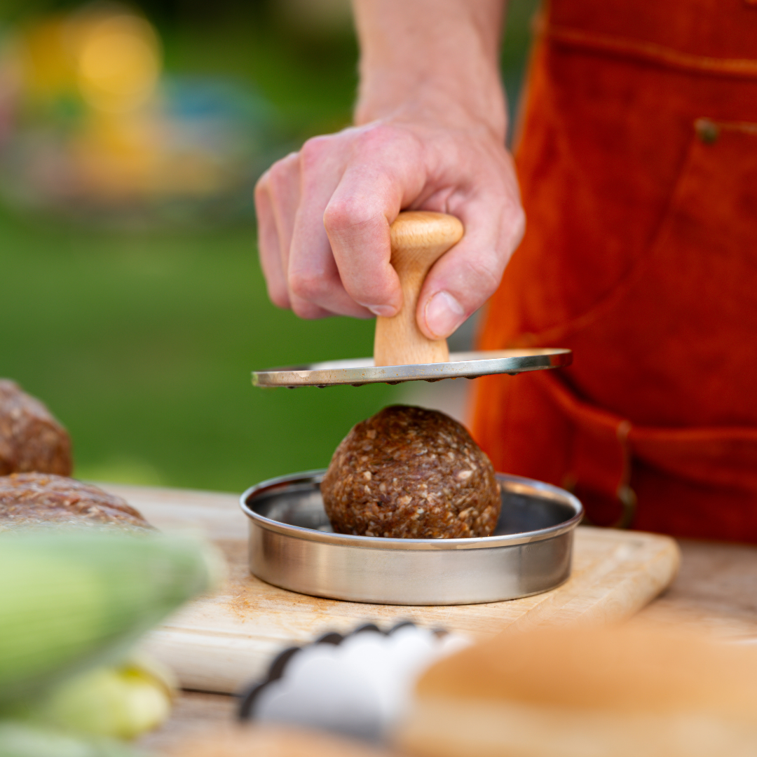 Do not overwork the meat unnecessarily. Handle the meat as little as possible, or only enough to bind it together. Overworking the meat leads to tough and dry burgers. Shape meat patties gently. Try to make the centre of the patty slightly thinner than the edges. This will help the patty to cook through evenly. It is ideal to use a hamburger press for shaping. It allows you to handle the meat as little as possible and simply form the patty to the desired thickness.